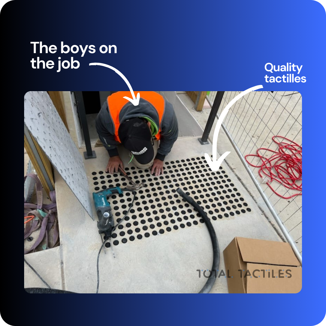 We install tactiles onto most surfaces as long as they meet Australian Standard AS 1428.4.1 requirements for substrate integrity and adhesion. Before install, we’ll always assess your site to confirm it's compliant and suitable.